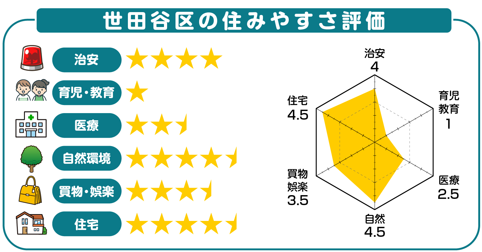 広々とした面積の中に緑あふれる公園や河川、渓谷などが散らばる世田谷区の住みやすさについてご紹介してきました。治安の良さや娯楽施設の豊富さを見ても、ただ閑静なだけではない暮らしに適した街並みが想像できます。待機児童の積極的な解決など、子育て支援にも力を入れており、ファミリー層にもおすすめの地域です。