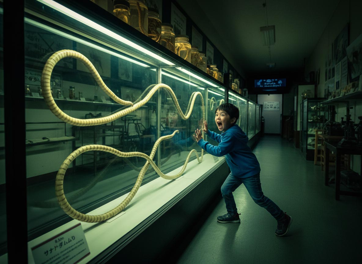 館内に展示されている「8.8メートルのサナダムシ」にまつわるもの。この標本をじっと見つめすぎると、「自分の体の中でも何かが動いている感覚に襲われる」という、一種の精神的な感染(ミーム)の噂。
